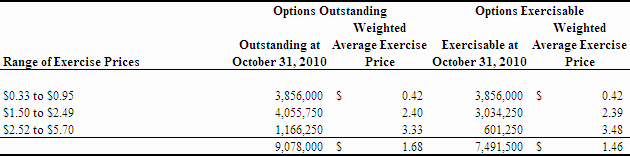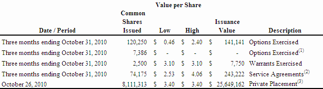 As at October 31, 2010, we had 9,078,000 stock options and 9,285,041 share purchase warrants outstanding. The outstanding stock options have a weighted average exercise price of $1.68 per share and the outstanding warrants have a weighted average exercise price of $3.36 per share. Accordingly, as at October 31, 2010, the outstanding options and warrants represented a total of 18,363,041 shares issuable for proceeds of approximately $46,448,778 if these options and warrants were exercised in full. The exercise of these options and warrants is at the discretion of the holders and, accordingly, there is no assurance that any of these options or warrants will be exercised.