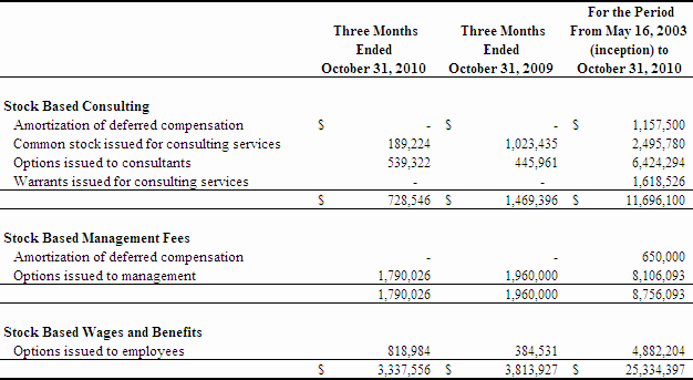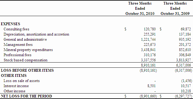 Our net loss during the three months ended October 31, 2010 was $8,901,660 or $0.15 per share compared to $6,297,727 or $0.11 per share during the same period ended October 31, 2009.