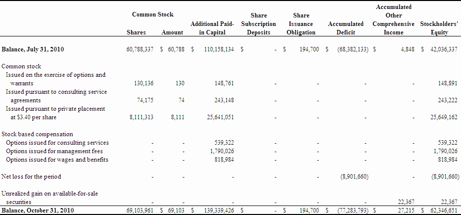 Net cash provided by financing activities during the three months ended October 31, 2010 was $25,934,868 compared to $138,927 during the same period ended October 31, 2009. During the current period, we received net proceeds of $148,891 from the exercise of stock options and warrants. We also received net proceeds of $25,649,162 from the sale of our common stock pursuant to private placements.