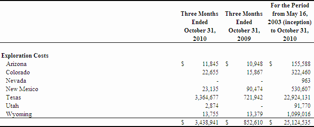 Net production revenues during the three months ended October 31, 2010 and 2009 were $Nil. Our net loss for the three months ended October 31, 2010 was $8,901,660 compared to $6,297,727 during the three months ended October 31, 2009.