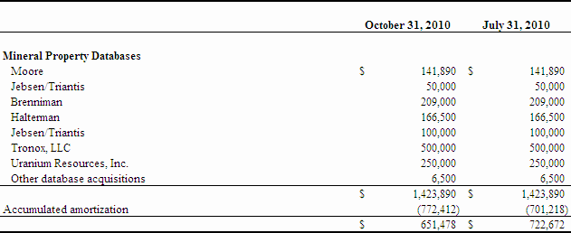 Costs related to internally developed databases are expensed as incurred. Costs of acquired mineral property databases are capitalized upon acquisition. Mineral property data bases are tested for impairment whenever events or changes indicate the carrying value amount may not be recoverable. An impairment loss is recognized if it is determined that the carrying amount is not recoverable and exceeds fair value. Mineral property databases are amortized over five years using the straight-line method, which is the period over which management believes the asset will contribute to the Company's cash flows.