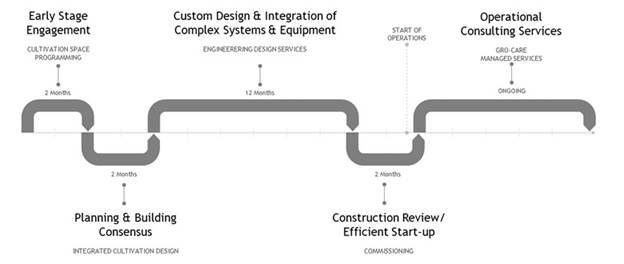 We aim to work with our clients for the life of their facility – providing value to them from inception through ongoing facility operation. We are a trusted partner and advisor to our clients and offer a complete set of engineering and managed services complemented by a vetted suite of select cultivation equipment systems. Outlined below is an example of a complete project with estimated time frames for each phase that demonstrate how we provide value to our clients for the life of their facility.