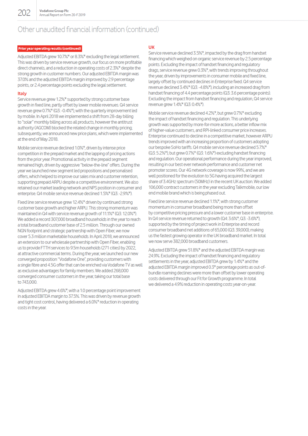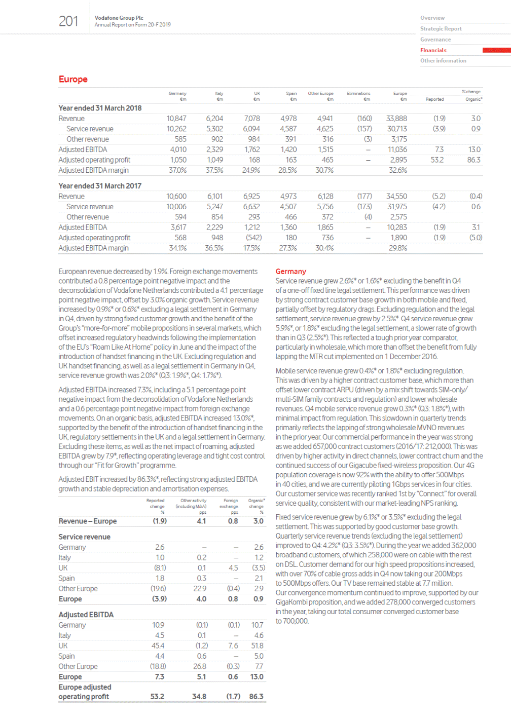 Annual Report on Form 20-F 2019 Chief Executives review A focus on operational excellence and organic growth The acquisition of Liberty Globals assets in Germany and Central Eastern Europe will complete Vodafones strategic transformation into a converged leader, owning Europes largest 4G/5G mobile networks, Europes broadest gigabit-capable NGN network and Africas leading data networks. We will be strongly positioned to achieve our long-term goals enabling the digital society, supporting inclusion for all and protecting the planet. This purpose-driven approach underpins our ambition to drive organic revenue growth, expand EBIT margins and increase our cash generation. I believe that success in this next phase of Vodafones transformation requires a renewed focus on operational excellence and more consistent commercial performance across the Group. When I stepped into the Chief Executive role last October, I identified three key priorities for the business. In mature markets we need to focus on deepening engagement with our existing customers, primarily by selling one more product to grow revenue and lower churn. We need to accelerate our digital transformation, improving both the customer experience and the efficiency of our operations through a radically simpler approach. And we need to explore all options to improve the utilisation of our leading network assets through a renewed emphasis on partnering. We explore the progress we are making on each of these priorities in detail on pages 14 to 21. The decision to rebase our dividend in order to support the execution of our strategy and rebuild financial headroom has not been taken lightly. However, I am convinced that this is the right approach for the Group, and will enhance our ability to deliver much improved total returns for our shareholders. A new social contract is needed for the industry At the same time, I believe a new approach is needed by the industry and by governments if society is to gain the maximum benefit from the opportunities presented by the digital society. These opportunities are reflected in the ambitious goals that underpin Vodafones purpose: to improve one billion lives and halve our environmental impact by 2025. During the coming year we will work to develop Vodafones social contract with policy makers, politicians and regulators based on the shared principles of duty of care, fairness and leadership. Through such contracts our vision is that the industry commits to intensify its efforts to simplify and improve services to customers, and ensures better network coverage, whereas in return regulators reassess their approach to the sector, ensuring a competitive environment that provides an adequate return on the substantial investments that will be needed to deliver an inclusive digital society. Review of the year Last year we delivered a good financial performance in Germany, the UK and Other Europe, which offset significant competitive challenges in Spain and Italy and a macro and regulatory driven slowdown in South Africa. Although our service revenue growth slowed in the second half of the year, the recovery in our commercial performance, especially in Italy and Spain, was encouraging, and European mobile churn reduced to a record low in the second half. All else being equal, these improvements lay the foundation for a gradual recovery in our performance in FY20. In our key customer segments, Europe Consumer service revenues declined by 1.1%1, but grew 2.7%1 excluding Spain and Italy, supported by our strong momentum in broadband where we remained Europes fastest growing operator. Vodafone Business grew by 0.3%, with continued competition in mobile offset by market share gains in fixed and good growth in IoT and Cloud. I am excited about the disruptive opportunity for further fixed share gains created by new Software Defined Networking solutions. Emerging Consumer grew at 7.4%, driven by data services and the ongoing success of our unique mobile financial services platform M-Pesa. Investing and partnering to deliver leading Gigabit Networks Investing in leading network assets is at the heart of our strategy, and we remain committed to providing a differentiated customer experience compared to value players. However, in all of our markets at least one other leading player shares a similar network vision. Sharing our passive infrastructure assets, such as our towers and fibre backhaul, as well as active radio equipment (outside major cities) allows both parties to reduce operating costs and capital expenditures without sacrificing quality or differentiation. Most importantly, by sharing in this way our customers benefit from improved coverage and a faster rollout of 5G services than either partner could have achieved on their own, and we significantly reduce our environment impact as a result of fewer sites and less active equipment. We have announced network sharing discussions in the UK with O2 and in Italy with Telecom Italia, we have concluded an agreement across both mobile and fixed with Orange in Spain, and we see further opportunities across our markets. In addition, these deals unlock a range of tower monetisation options, which we are actively exploring. Note: 1 Excluding UK handset financing and one-off settlements. 12 Vodafone Group Plc