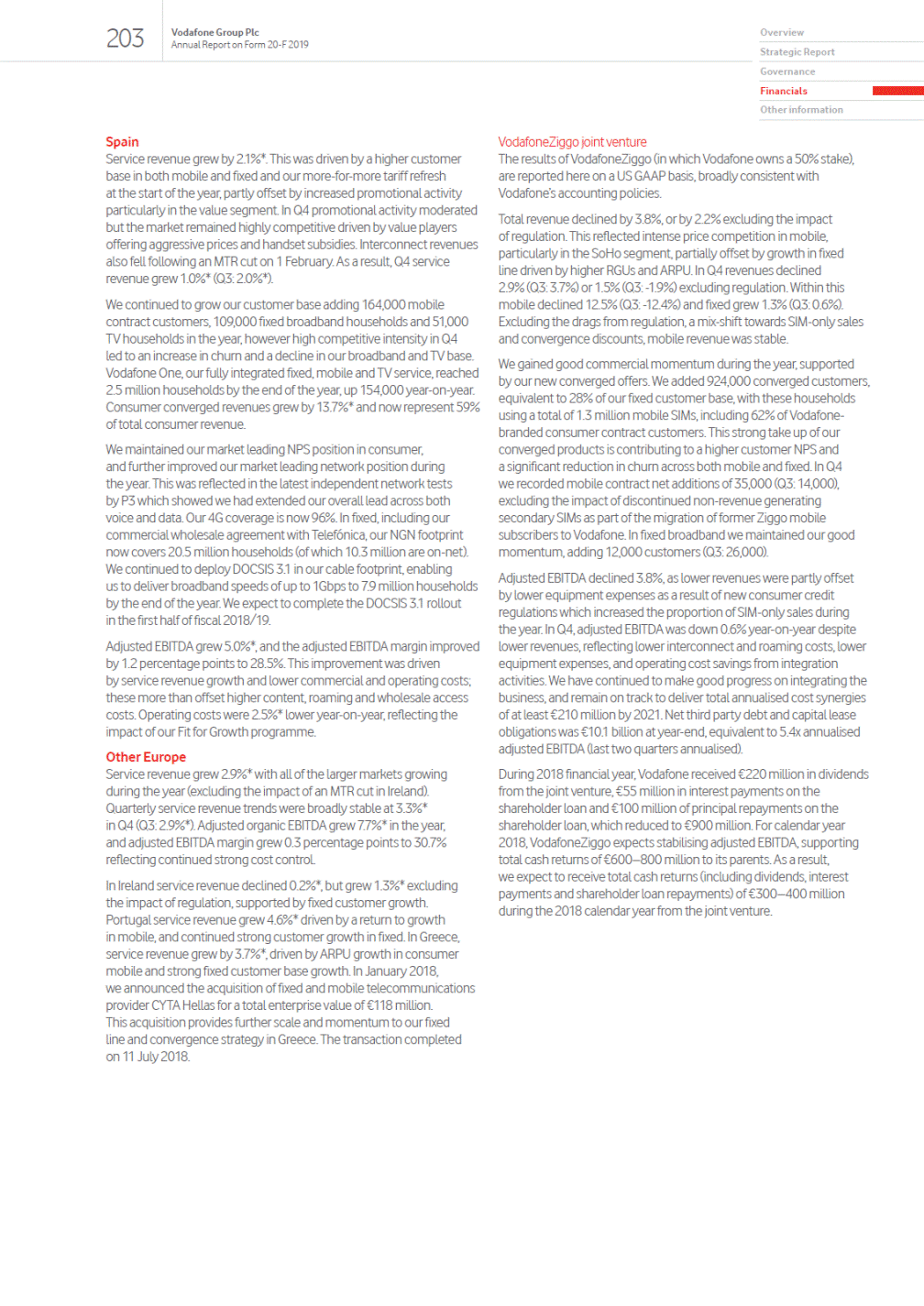 Overview Strategic Report Governance Financials Other information Mobile contract net adds Fixed service revenue growth IoT SIM growth Strategic update The acquisition of Liberty Globals assets will complete Vodafones strategic transformation into a converged leader. I believe that success in the next phase of Vodafones transformation requires a renewed focus on operational excellence and more consistent commercial performance across the Group. Nick Read Chief Executive 12 Read more Supporting a record low mobile Reductioninfrequencyofcustomercontact European net opex saving achieved unlocking industrial synergies Financial priorities As Group CFO I am focused on three key objectives for the business. First, to drive better returns on capital in Europe. Second, to transform our cost base by leveraging new digital technologies. And third, deleveraging the balance sheet with the aim to move to the lower end of our targeted 2.5x-3.0x range in the next few years. Margherita Della Valle Chief Financial Officer 24 Read more Accelerated M&A synergy targets In Germany, Czech Republic, Hungary and capex synergies Improving asset utilisationPortfolio management Network sharing agreements India Announcements in the UK, Italy and Spain Vodafone Idea merger completed Indus Towers merger awaiting approval New Zealand sale announced, 2.1bn Partnerships announced with: ARM and AT&T for IoT, and IBM for Cloud Lowering our capital intensity and unlocking new potential revenue streams Acquisition of Liberty Globals assets VodafoneZiggo one year ahead of plan Romania expected to complete by July 2019. Vodafone Idea two years ahead of plan Targeting 535 million of annual cost and Accelerating digital transformation 28% European fixed line sales from digital channels New digital only plans launched Improving customers experienceSimplifying our customer offering at lower cost 12% 0.4bn Improving efficiency in customer service byTargeting >1.2 billion over three years rolling out chatbots and digital applications Driving consistent commercial performance +819k+3.8% +719k+24.1% Broadband net adds +1.1m Converged consumer customers+2.7m contract churnMobile data users Emerging Consumer Vodafone Business Europe Consumer 05 Vodafone Group Plc Annual Report on Form 20-F 2019