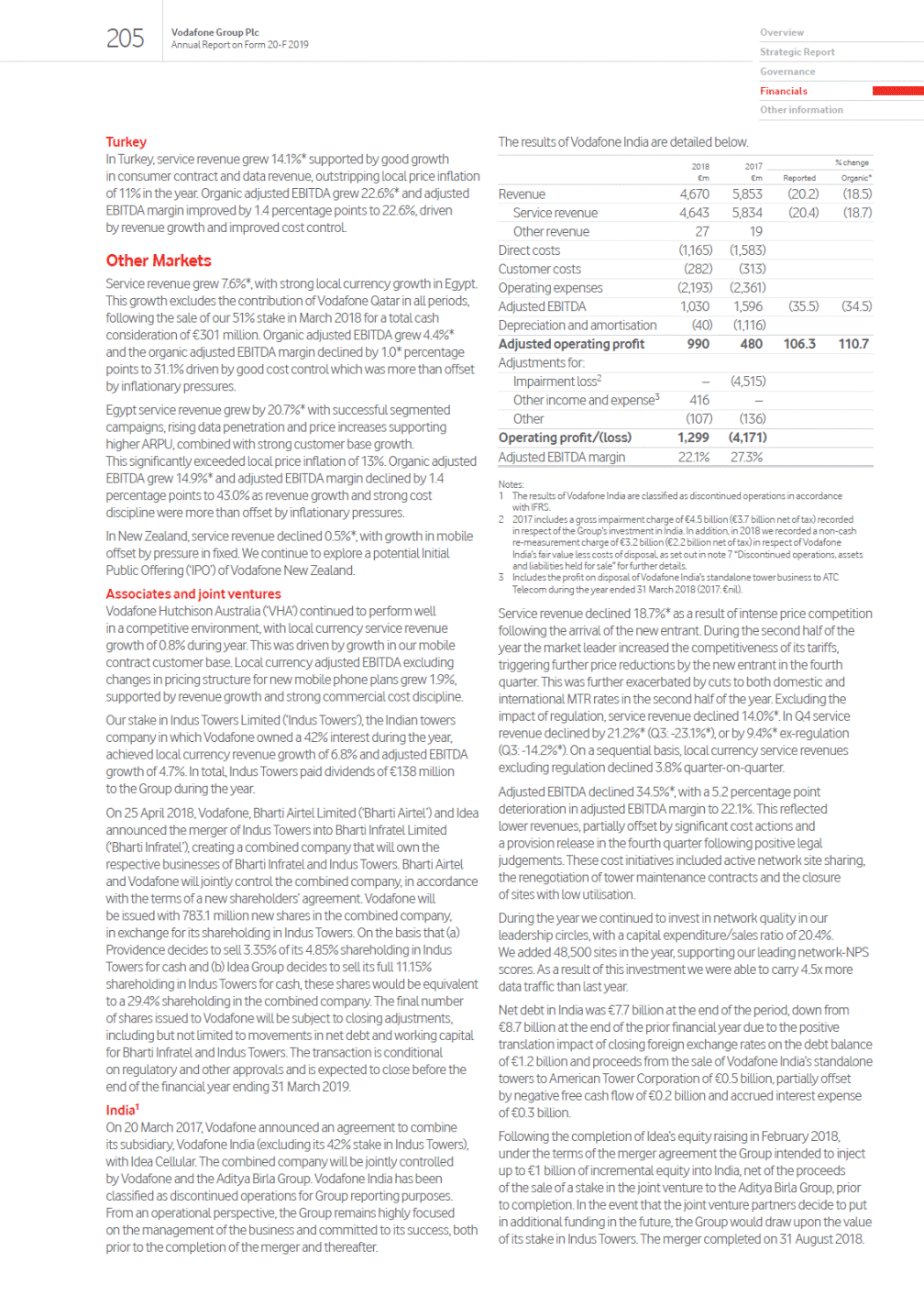 Annual Report on Form 20-F 2019 Chairmans statement Evolving our strategy to address industry headwinds On a reported basis our business declined due to the sale of Qatar, a lower benefit from handset financing in the UK and a number of settlements in the prior year. This performance reflected good revenue and profit growth in Germany, UK and Other Europe, offset by earnings declines in Spain and Italy. In Spain we took action to commercially reposition the business given increased price competition in the value segment, while in Italy we faced a new entrant in the mobile market. South Africa also slowed in the second half, impacted by a weak macroeconomic environment and new data regulation. Delivering a better future requires regulators to play their part One of Nicks first decisions was to put the companys refreshed purpose We connect for a better future at the core of our strategy. We have committed to improve one billion lives and halve our environmental impact by 2025, as we discuss on page 3 opposite. This ambition to enable the digital society, support inclusion for all and protect our planet is part of our broader commitment to operating responsibly, recognising that over the long-term the success of our business is inextricably linked to the success of the communities in which we operate. However, policy makers and regulators also need to play their part by ensuring a competitive environment that provides an adequate return on the substantial investments that will be needed to meet these important societal goals. This is especially important in Europe, where returns on capital have fallen to unsustainably low levels. Improving return on capital and driving commercial and operational performance will be the top priorities for your Board and for the company, aiming to make Vodafone the best value proposition in our industry for customers and for shareholders. /s/ Gerard Kleisterlee Gerard Kleisterlee Chairman During the past year we have experienced a significant fall in our share price. Despite good performance in most markets, we faced increasing competition in Spain and Italy, as well as pressures in South Africa during the second half of the year. Although we met our financial guidance, our revenue growth slowed during the year and 5G spectrum auction costs were high, reducing our financial headroom and contributing to downward pressure on our share price. A decline in the value of our listed stake in Vodafone Idea was a further headwind. Rebasing the dividend to support Vodafones transformation and rebuild headroom Vodafone is at a key point of transformation deepening customer engagement, accelerating digital transformation, radically simplifying our operations, generating better returns from our infrastructure assets and continuing to optimise our portfolio. In order to support these goals and to rebuild headroom, the Board has made the decision to rebase the dividend to 9 eurocents per share. This will help us to reduce debt and move to the lower end of our targeted 2.5x-3.0x leverage range in the next few years. On pages 24 and 25, Margherita describes the comprehensive programme of further deleveraging actions that we are taking, including the sale of our business in New Zealand for 2.1 billion which we announced in May 2019. The Boards decision to rebase the dividend was not taken lightly, but we believe it is a necessary step to ensure that we deliver on our ambition to improve returns on capital, grow free cash flow and drive shareholder value. Going forward we intend to maintain a progressive dividend policy. Executing at pace on our new strategic priorities Under the leadership of our new Chief Executive, Nick Read, the Board has evolved the Groups strategy to respond to ongoing industry headwinds. Nick and his team have executed at pace and made encouraging progress on improving the consistency of our commercial performance, particularly in Spain and Italy. Mobile contract churn fell to a record low level in the year, and we have already put in place actions which will deliver over half of our FY21 cost reduction targets. We are also making rapid progress in our efforts to improve capital efficiency through our smart capex approach in combination with a number of important industry partnerships, particularly for 5G network sharing. These sharing agreements also unlock potential tower monetisation options. Nick describes this revised strategy on pages 12 to 21. On track to complete the Liberty Global deal in July In May 2018, we announced the acquisition of Liberty Globals assets in Germany, the Czech Republic, Hungary and Romania. This acquisition positions Vodafone as Europes largest next generation network (NGN) infrastructure owner, the leading converged challenger to the incumbents in these markets and unlocks synergies with an NPV of over 7.5 billion. We have offered a package of remedies to the European Commission, including a broadband wholesale access agreement with Telefonica Deutschland, and we expect the acquisition to complete in July 2019. Recapitalising Vodafone Idea in India We completed the merger of Vodafone India and Idea Cellular in August 2018, creating a new leading player, Vodafone Idea. However, the competitive environment remained challenging during the year as industry prices remain below cash costs. In response, we have accelerated our integration efforts, targeting full realisation of cost synergies by FY21, two years earlier than originally planned. In addition, we decided to strengthen Vodafone Ideas balance sheet by raising 3.2 billion of new equity through a rights issue, which completed in May 2019. Vodafone contributed 1.4 billion (funded by a loan secured against our Indian assets), and our partner Aditya Birla Group committed 0.9 billion. These funds, together with the opportunity to monetise its tower and fibre assets, will enable Vodafone Idea to continue to invest and to participate fully in a potential industry recovery. Duri