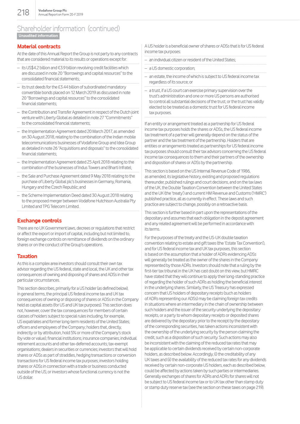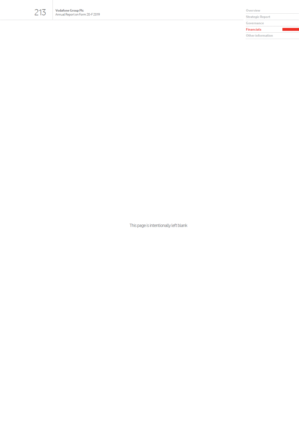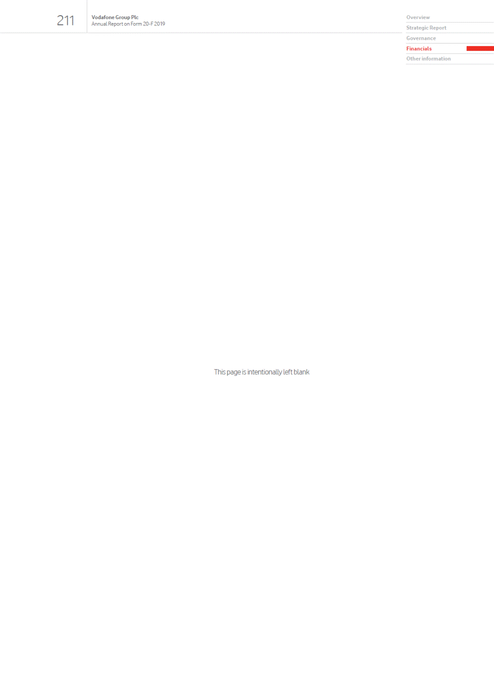 Contents Overview 01 Our strategic framework Welcome to our 2019 report 02 Chairmans statement 03 Our purpose 04 Highlights of the year Strategic Report 06 Our business at a glance 08 Key trends shaping our industry 10 Our business model 12 Chief Executives review 14 Our strategy 22 Key performance indicators 24 Chief Financial Officers review 26 Our financial performance 34 Financial position and resources 36 Sustainable business 42 Our people and culture 44 Principal risk factors and uncertainties Governance 52 Chairmans governance statement 54 Board leadership and company purpose 55 Division of responsibilities 56 Board of Directors 58 Executive Committee 60 Board activities 62 Engaging with our stakeholders 65 Induction, development and evaluation 68 Nominations and Governance Committee 71 Audit and Risk Committee 77 Remuneration Committee 81 Remuneration Policy 87 Annual Report on Remuneration 97 Our US listing requirements 98 Directors report Financials 99 Reporting our financial performance 100 Directors statement of responsibility 103 Risk mitigation 110 Report of independent registered public accounting firm 111 Consolidated financial statements and notes 200 Other unaudited financial information 206 This page is intentionally left blank Other information 214 Shareholder information 221 History and development 222 Regulation 231 Alternative performance measures This constitutes the annual report on Form 20-F of Vodafone Group Plc (the Company) in accordance with the requirements of the US Securities and Exchange Commission (the SEC) for the year ended 31 March 2019 and is dated 7 June 2019. This document contains certain information set out within the Companys annual report in accordance with International Financial Reporting Standards (IFRS) as issued by the International Accounting Standards Board (IASB), adopted by the EU and with those parts of the UK Companies Act 2006 applicable to companies reporting under IFRS, dated 14 May 2019, as updated or supplemented if necessary. The content of the Groups website (www.vodafone.com) or any other website referenced in this document is not incorporated into this document and should not be considered to form part of this annual report on Form 20-F. We have included any website as an inactive textual reference only. All amounts marked with an * represent organic growth which presents performance on a comparable basis, both in terms of merger and acquisition activity and movements in foreign exchange rates. Organic growth is an alternative performance measure. See Alternative performance measures on page 231 for further details and reconciliations to the respective closest equivalent GAAP measure. 246 Form 20-F cross reference guide 249 Forward-looking statements 250 Definition of terms 253 Selected financial data Exhibit 2.4 Exhibit 2.5 Exhibit 4.3 Exhibit 4.4Exhibit 4.8Exhibit 4.10 Exhibit 4.11 Exhibit 4.25 Exhibit 4.26 Exhibit 4.27 Exhibit 4.30 Exhibit 4.33