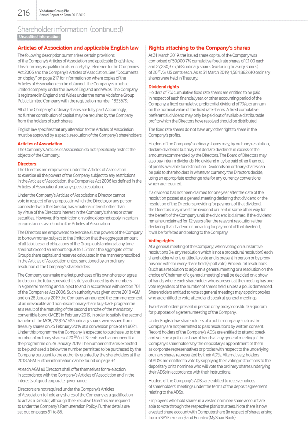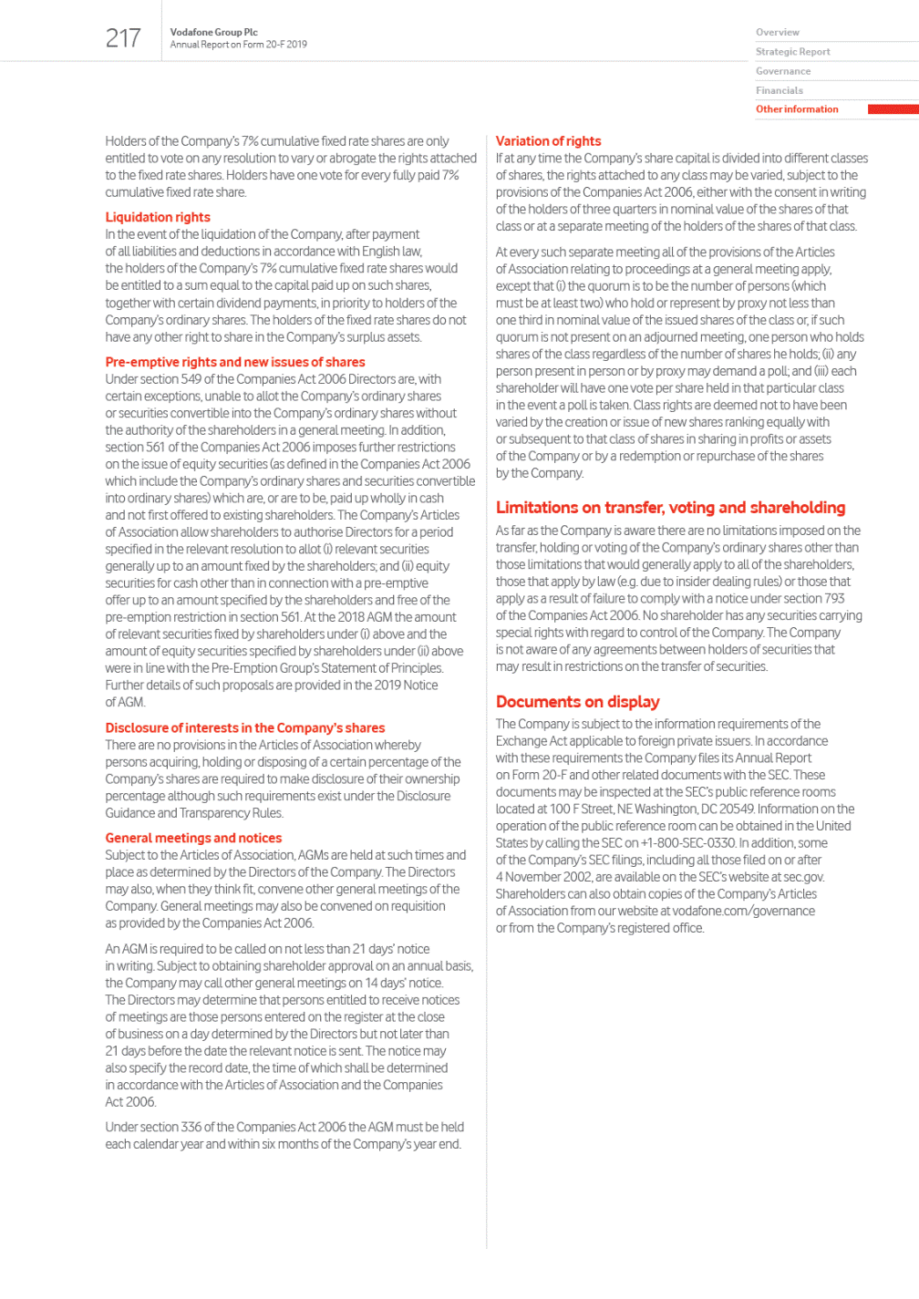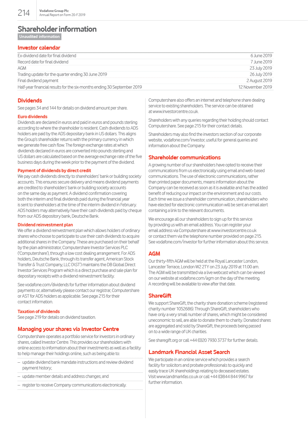 Contents Overview 01 Our strategic framework Welcome to our 2019 report 02 Chairmans statement 03 Our purpose 04 Highlights of the year Strategic Report 06 Our business at a glance 08 Key trends shaping our industry 10 Our business model 12 Chief Executives review 14 Our strategy 22 Key performance indicators 24 Chief Financial Officers review 26 Our financial performance 34 Financial position and resources 36 Sustainable business 42 Our people and culture 44 Principal risk factors and uncertainties Governance 52 Chairmans governance statement 54 Board leadership and company purpose 55 Division of responsibilities 56 Board of Directors 58 Executive Committee 60 Board activities 62 Engaging with our stakeholders 65 Induction, development and evaluation 68 Nominations and Governance Committee 71 Audit and Risk Committee 77 Remuneration Committee 81 Remuneration Policy 87 Annual Report on Remuneration 97 Our US listing requirements 98 Directors report Financials 99 Reporting our financial performance 100 Directors statement of responsibility 103 Risk mitigation 110 Report of independent registered public accounting firm 111 Consolidated financial statements and notes 200 Other unaudited financial information 206 This page is intentionally left blank Other information 214 Shareholder information 221 History and development 222 Regulation 231 Alternative performance measures This constitutes the annual report on Form 20-F of Vodafone Group Plc (the Company) in accordance with the requirements of the US Securities and Exchange Commission (the SEC) for the year ended 31 March 2019 and is dated 7 June 2019. This document contains certain information set out within the Companys annual report in accordance with International Financial Reporting Standards (IFRS) as issued by the International Accounting Standards Board (IASB), adopted by the EU and with those parts of the UK Companies Act 2006 applicable to companies reporting under IFRS, dated 14 May 2019, as updated or supplemented if necessary. The content of the Groups website (www.vodafone.com) or any other website referenced in this document is not incorporated into this document and should not be considered to form part of this annual report on Form 20-F. We have included any website as an inactive textual reference only. All amounts marked with an * represent organic growth which presents performance on a comparable basis, both in terms of merger and acquisition activity and movements in foreign exchange rates. Organic growth is an alternative performance measure. See Alternative performance measures on page 231 for further details and reconciliations to the respective closest equivalent GAAP measure. 246 Form 20-F cross reference guide 249 Forward-looking statements 250 Definition of terms 253 Selected financial data Exhibit 2.4 Exhibit 2.5 Exhibit 4.3 Exhibit 4.4Exhibit 4.8Exhibit 4.10 Exhibit 4.11 Exhibit 4.25 Exhibit 4.26 Exhibit 4.27 Exhibit 4.30 Exhibit 4.33